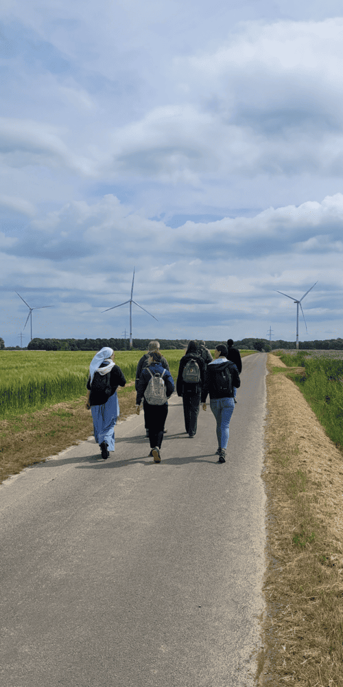 Um 10 Uhr war Treffpunkt am Bahnhof in Salzkotten. 12 Pilger*innen hatten sich eingefunden. Schwester Edith, im Orden der Frères et Soeurs de Jérusalem unterwegs, war eigens angereist, um mit den jungen Leuten auf dem Weg zu sein.
